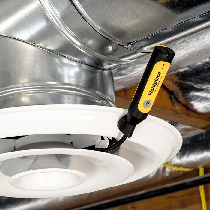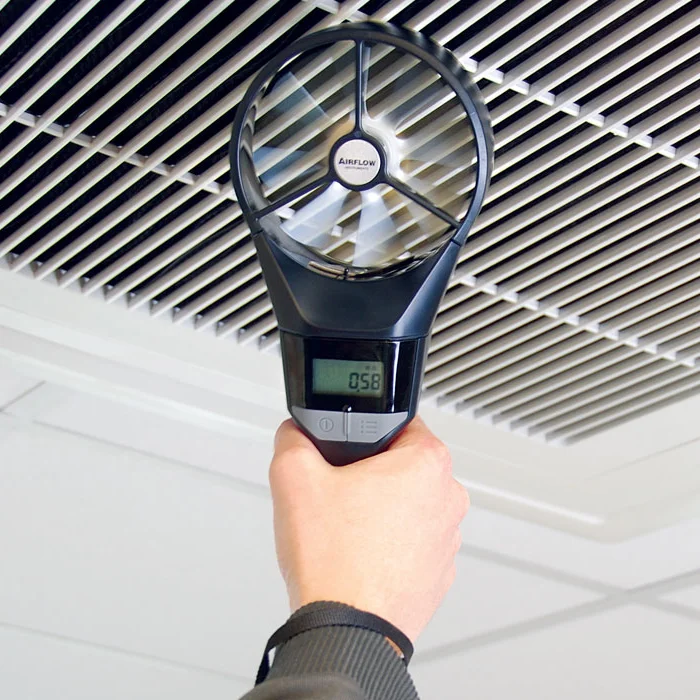 Dans le cas de pompes à chaleur air-air, il est important de mesurer le débit côté sortie. Il existe plusieurs solutions à cet effet. Si vous disposez déjà d’un manomètre LIGNE BLEUE adéquat ou d’un analyseur de gaz de fumée avec mesure de pression intégrée, vous pouvez vous contenter d’un tube de Pitot. Vous pouvez également choisir un compteur à roue à ailettes, complété éventuellement d’un cône de mesure approprié.
