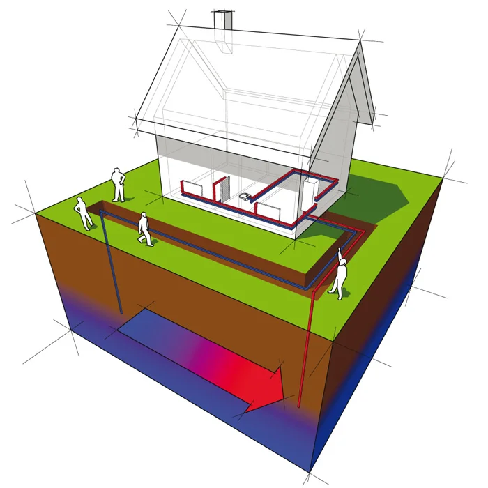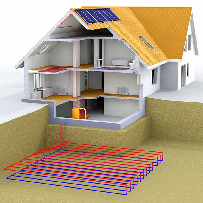Dans ce cas, la chaleur est extraite d’un système de conduites dans le sol. C’est une source fermée, les conduites étant généralement remplies d’une combinaison d’eau et d’antigel (glycol). La chaleur obtenue est également délivrée à l’habitation, par exemple par chauffage au sol ou par l’eau courante (boiler échangeur).
