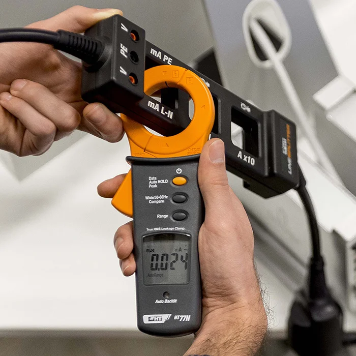 Dans le cas de systèmes électriques, surtout lorsqu’ils impliquent de l’eau ou d’autres liquides, il est important de pouvoir mesurer le courant de fuite. En cas de courant de fuite trop élevé, l’interrupteur de mise à la terre se déclenche et l’installation est mise hors tension. Étant donné que les courants de fuite ont des valeurs particulièrement faibles, il est important d’utiliser une pince spéciale pour courant de fuite. Si vous voulez mesurer le courant de fuite dans un appareil avec un cordon d’alimentation secteur, vous pouvez utiliser le HT Instruments HT1735, en plus d’une pince pour courant de fuite. Cet accessoire pratique rend le dénudage et l’épissage du cordon d’alimentation secteur superflus, ce qui permet de gagner beaucoup de temps.