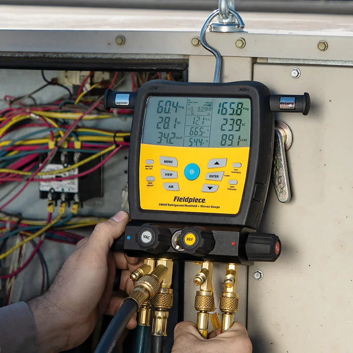 De nombreuses pompes à chaleur sont fournies remplies mais si vous faites vous-même l’appoint d’agent réfrigérant, vous avez besoin de divers instruments de mesure dont une unité de pompage, un jeu de manomètres (manifold), un détecteur de fuite de fréon et un vacuomètre.
