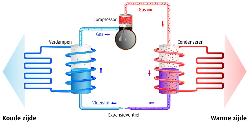 À une pression normale, le fluide frigorigène considéré se présente à l’état de gaz à faible point d’ébullition. Le passage de ce gaz à travers un compresseur a pour effet d’en augmenter la pression et le point d’ébullition à un niveau tel que le gaz se condense (devient liquide) à la température ambiante. La chaleur dégagée lors du processus de condensation est cédée à l’environnement du côté chaud de l’installation. Le transfert de chaleur se traduit par un refroidissement du fluide frigorigène liquide, lequel gagne ensuite un détendeur au sein duquel s’opère une baisse sensible de la pression et du point d’ébullition du fluide. En conséquence, la température ambiante qui règne du côté froid est suffisamment élevée pour amener le fluide frigorigène à sa température d’ébullition et le refaire passer à l’état gazeux (évaporation). Lors de ce processus, l’environnement cède une certaine quantité de chaleur à l’installation. À ce stade, le compresseur aspire à nouveau le fluide frigorigène, après quoi le cycle se répète.