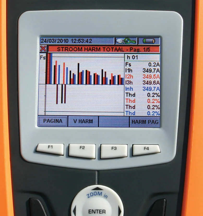 La cause de la distorsion harmonique s'explique presque toujours par la présence d’un harmonique de courant. Pour en obtenir un aperçu aussi clair que possible, il est important de mesurer au plus près de l'appareil dont vous pensez qu'il est la cause de la pollution du réseau. Les harmoniques ne sont généralement pas un phénomène constant, il est donc important d'effectuer (connecter) la mesure sur une longue durée. Cela permet de réaliser une meilleure analyse.