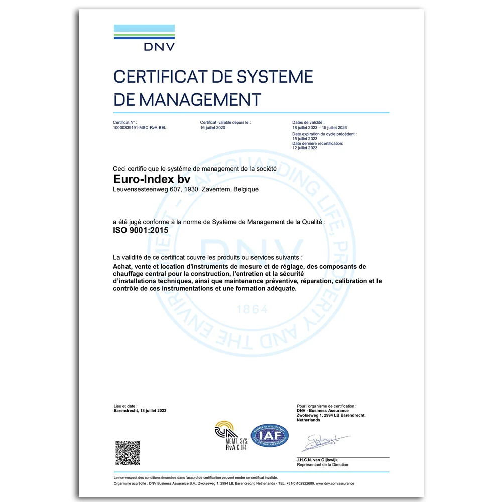 EURO-INDEX bv démontre ainsi que le système de qualité utilisé pour l'achat et la vente, la location, la maintenance, la réparation et l'étalonnage de ses instruments de mesure répond aux normes élevées ISO 9001. La recherche continue de la qualité au sein de l'organisation, soutenue par produits et services de haute qualité, EURO-INDEX bv est devenu ces dernières années un acteur clé dans le domaine des instruments de mesure, de la maintenance et des étalonnages. Les systèmes de qualité d'EURO-INDEX bv garantissent une amélioration continue de nos services, en fin de compte une chose est primordiale: des clients satisfaits.