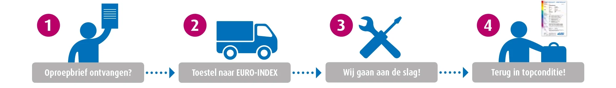 - Vous emportez votre appareil chez EURO-INDEX ou vous appelez le 02 757 92 44et nous prenons soin du transport pour un faible prix. Vous pouvez également apporter votre appareil chez votre grossiste, mais si vous souhaitez que votre appareil soit retourné dans les plus brefs délais, nous vous conseillons d'envoyer votre appareil directement à Euro-Index (demandez simplement un enlèvement) ou de le remettre en personne à notre comptoir de service à Zaventem.