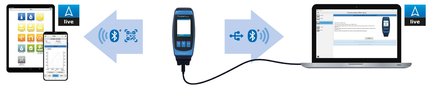 Als u met EuroSoft live software via Bluetooth® contact maakt met een CAPBs® handgreep worden de meetwaarden en menu’s weergegeven zoals op een BLAUWE LIJN® meetinstrument, inclusief de bediening. U kunt de actuele meetwaarde(n) uitlezen, evenals de maximaal en minimaal gemeten waarde en deze presenteren in een meetrapport. Het is ook mogelijk om meetwaarden gedurende een periode te loggen met een instelbaar interval. Deze meetwaarden kan u zowel numeriek als grafisch weergeven. Bij bepaalde sens meetmodules zijn aanvullende meetprogramma’s mogelijk, zoals een lekhoeveelheidsmeting (druk) of een meetfunctie voor legionellapreventie (temperatuur).