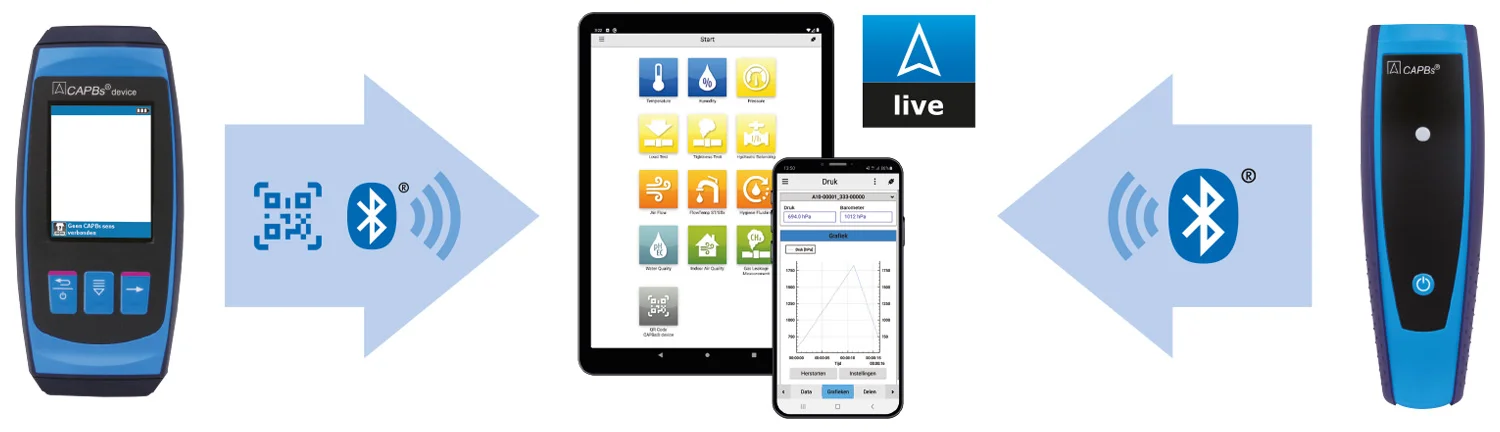 De EuroSoft live app is gratis verkrijgbaar voor smartphones en tablets met Android en iOS besturingssystemen. Als u met deze app via Bluetooth® Smart contact maakt met een CAPBs® handgreep worden de meetwaarden en menu’s weergegeven zoals op een BLAUWE LIJN® meetinstrument, inclusief de bediening. U kunt de actuele meetwaarde(n) uitlezen, evenals de maximaal en minimaal gemeten waarde en deze presenteren in een meetrapport. Het is ook mogelijk om meetwaarden gedurende een periode te loggen met een instelbaar interval. Deze meetwaarden kan u zowel numeriek als grafisch weergeven. Bij bepaalde sens meetmodules zijn aanvullende meetprogramma’s mogelijk, zoals een dichtheidstest (druk) of een meetfunctie voor legionellapreventie (temperatuur).